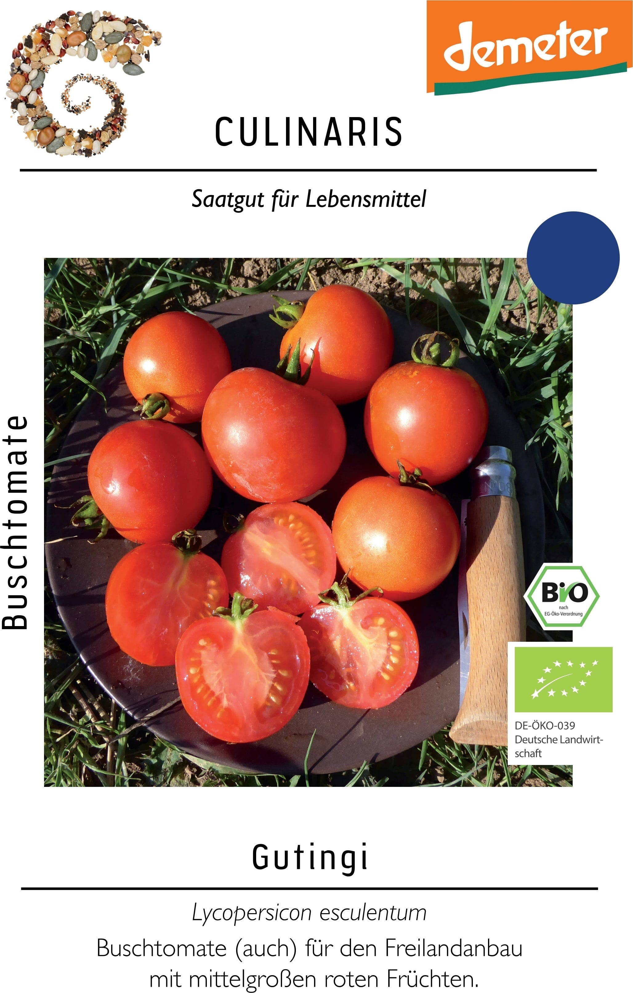 Gutingi ist eine ertragreiche Buschtomate mit saftigen, aromatischen Früchten. Sie wächst kompakt und liefert zuverlässig viele Früchte. Ideal für Freilandanbau, Balkone oder Gemeinschaftsgärten. Die Haupternte erfolgt von Juli bis Oktober.