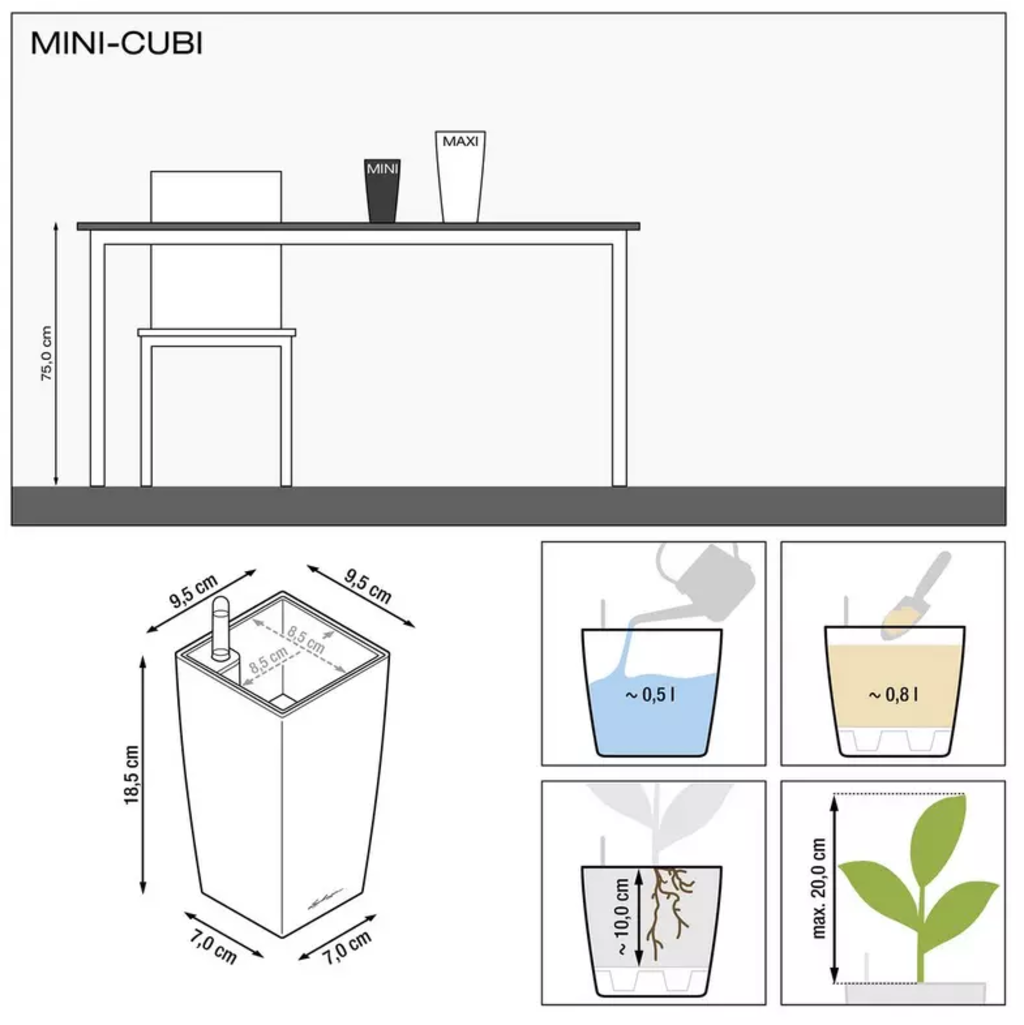 Der MINI-CUBI vereint elegantes Design mit praktischer Handhabung und hochwertiger Verarbeitung. Durch sein schlankes, modernes Format setzt er stilvolle Akzente in jedem Wohnraum. Dank des integrierten Wasserspeichers bleiben deine Pflanzen optimal versorgt, selbst wenn du einmal weniger Zeit zum Gießen hast. Die verschiedenen Farboptionen machen ihn zum vielseitigen Dekoelement – perfekt für einen harmonischen, modernen Look in deinem Zuhause.