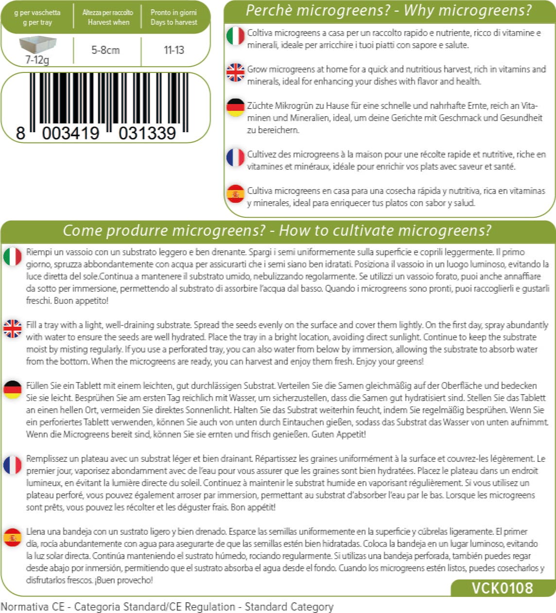 Remplissez un plateau avec un substrat léger et bien drainant et répartissez les graines uniformément à la surface. Recouvrez-les légèrement et maintenez une humidité constante dans un endroit lumineux, en évitant la lumière directe du soleil. Une vaporisation régulière ou un arrosage doux par immersion (en cas de plateau perforé), facilitent le maintien d'un substrat humide. Après peu de temps, vous pouvez déjà récolter et déguster vos micro-pousses.