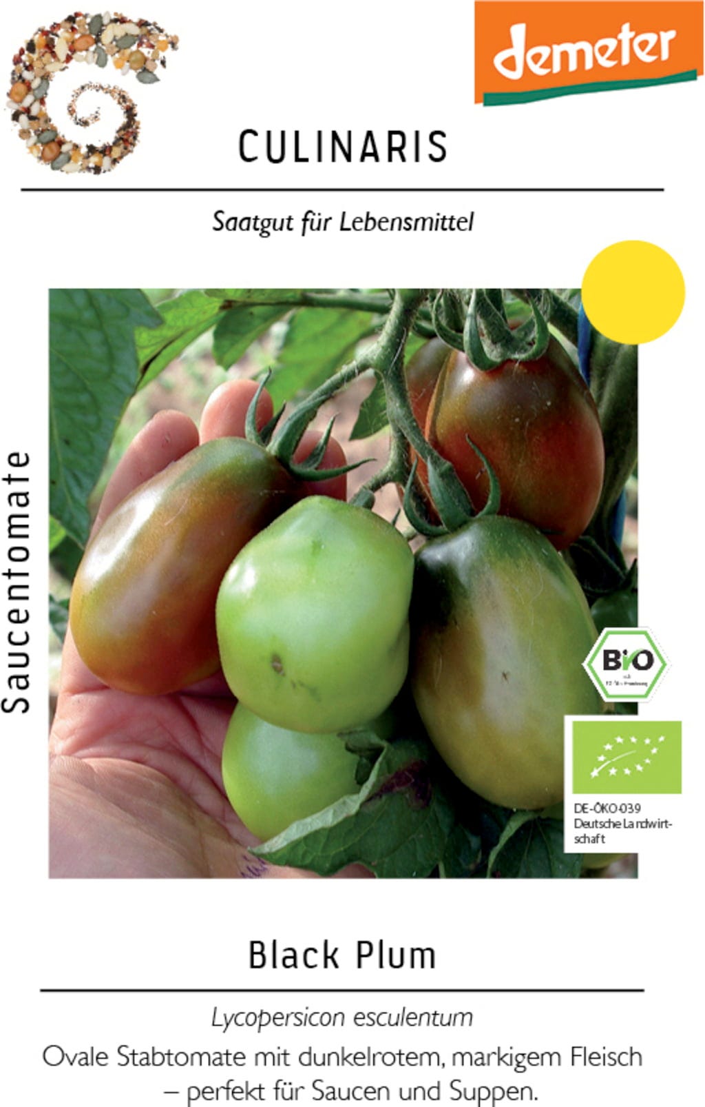 La Tomate Bio pour Sauce "Black Plum" historique à croissance indéterminée, est caractérisée par une chair ferme et rouge foncé. Elle est idéale pour les sauces, les soupes ou les salades fraîches. La plante pousse vigoureusement et sainement et doit être régulièrement ébourgeonnée. À partir de juillet, elle offre de manière fiable une récolte aromatique.