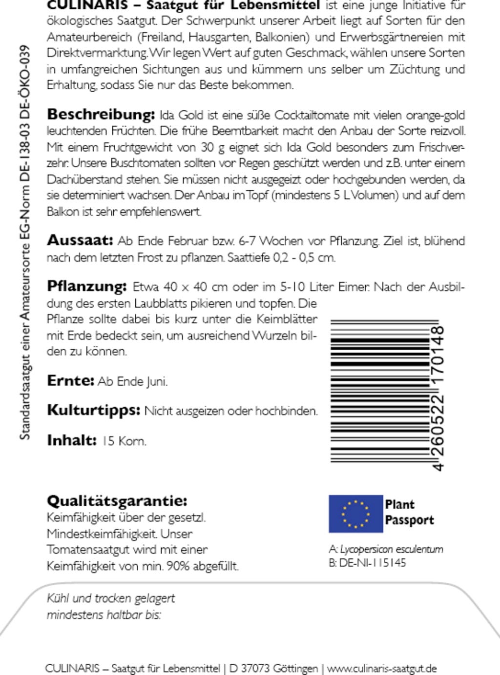 | Fabricant: | Culinaris - Saatgut für Lebensmittel, Thiegasse 5, 37124, Rosdorf, Allemagne, info@culinaris-saatgut.de, culinaris-saatgut.de |