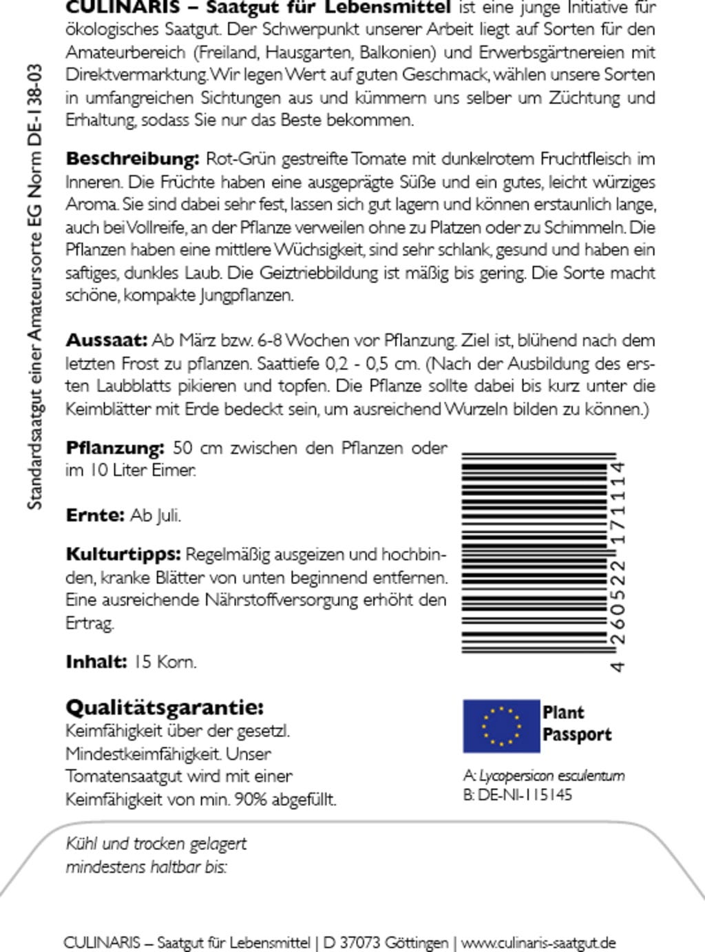 | Fabricant: | Culinaris - Saatgut für Lebensmittel, Thiegasse 5, 37124, Rosdorf, Allemagne, info@culinaris-saatgut.de, culinaris-saatgut.de |