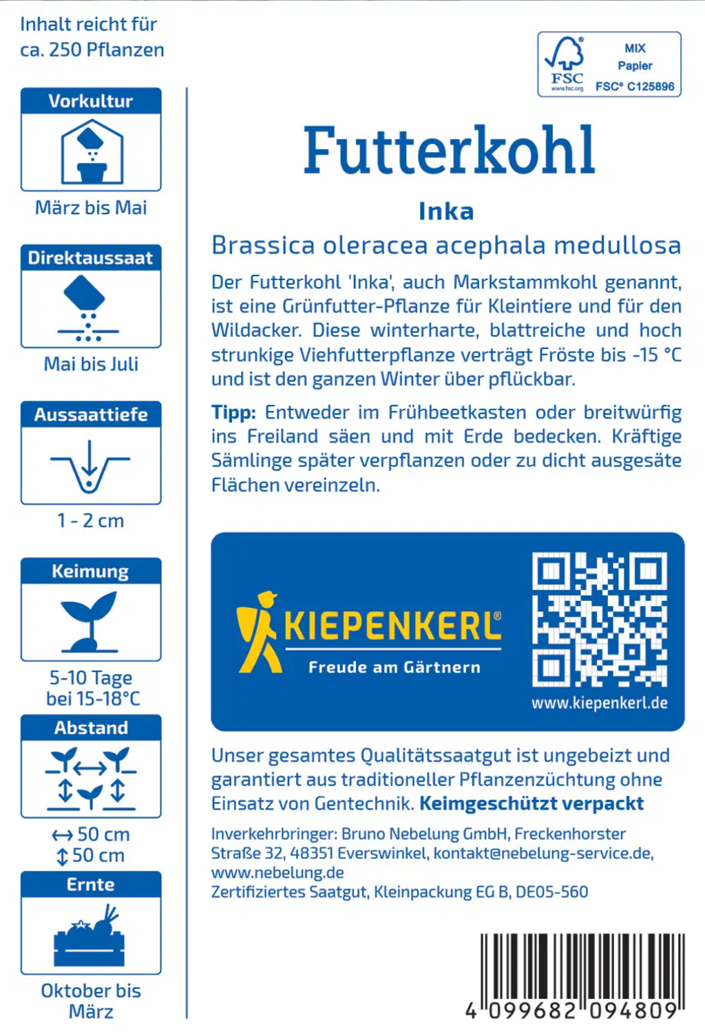 Le chou Inka est une variété robuste et rustique qui fournit du fourrage frais tout au long de l'hiver. Il pousse avec une tige haute, forme de nombreuses feuilles et est idéal pour les petits animaux ou les champs de gibier. Grâce à sa longue période de récolte et à sa culture facile, il est particulièrement populaire et polyvalent.