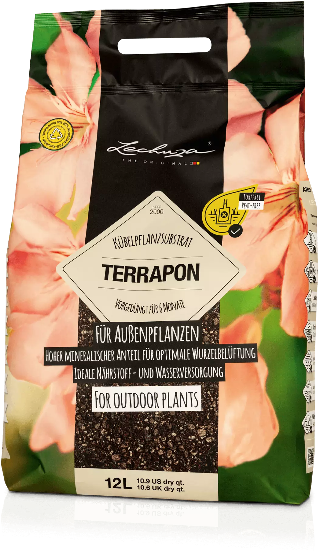 TERRAPON favorise une pousse saine et luxuriante de vos plantes, grâce à sa composition finement ajustée. Le substrat assure un rapport air-eau optimal, et contient également un mélange actif d'engrais, de sorte qu'il approvisionne continuellement la plante en pot en nutriments, pendant une période de 6 à 8 mois.