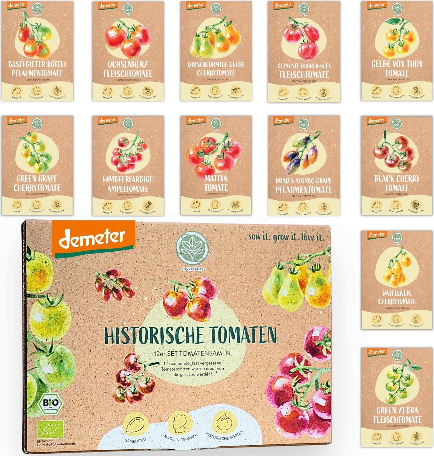 Ce Kit de Graines de Tomates Historiques Demeter garantit une récolte abondante de tomates délicieusement fraîches et fruitées. Les graines sans pesticides peuvent être facilement semées dans le jardin, sur le balcon ou sur le rebord de la fenêtre. Les sachets de graines sont en outre emballés de manière à protéger de la germination et se conservent donc particulièrement longtemps.