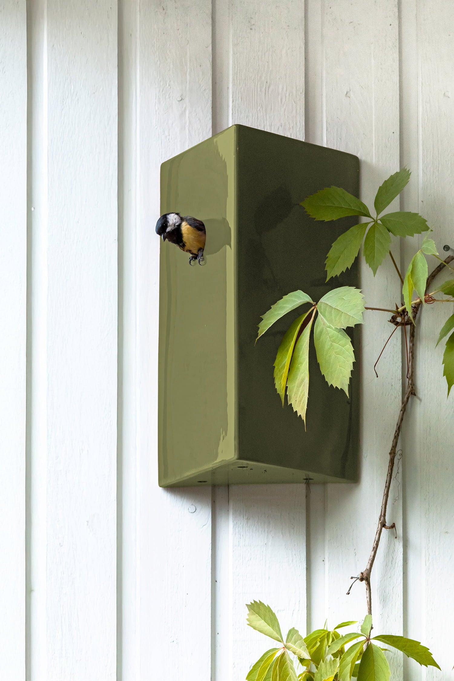 Le nichoir est fabriqué à la main au Portugal à partir de bois de pin traité thermiquement, non toxique, et de céramique émaillée. L’intérieur, sous l’ouverture de sortie, présente une texture rugueuse qui facilite la sortie des oiseaux.