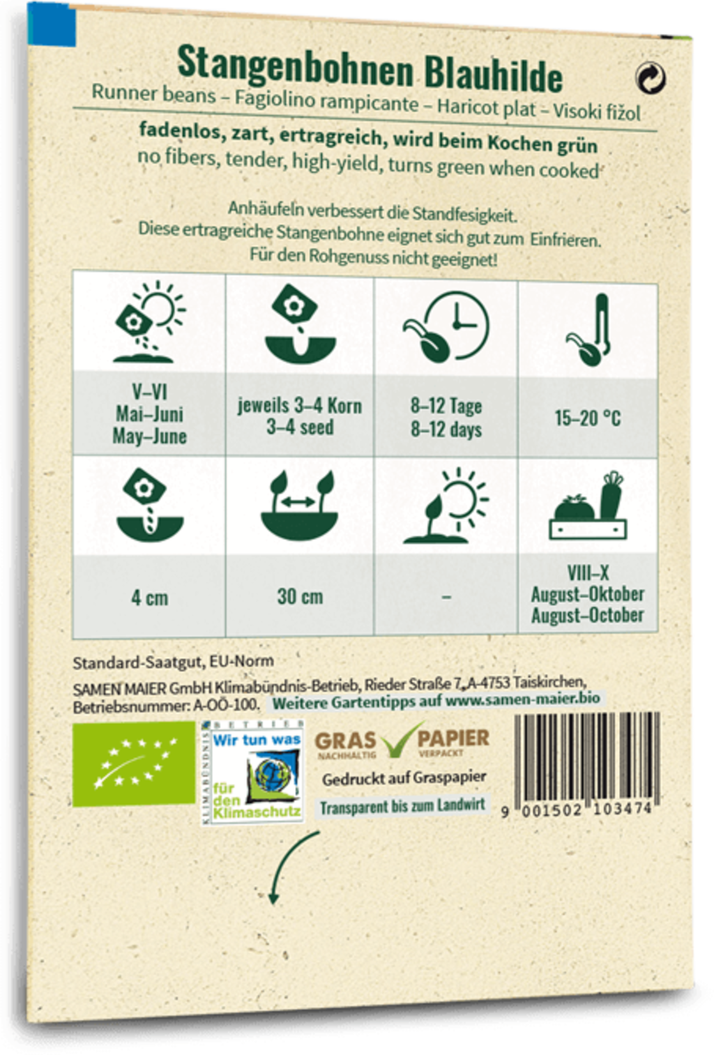 Samen Maier Haricot Vert Bio Sans Fil "Blauhilde"