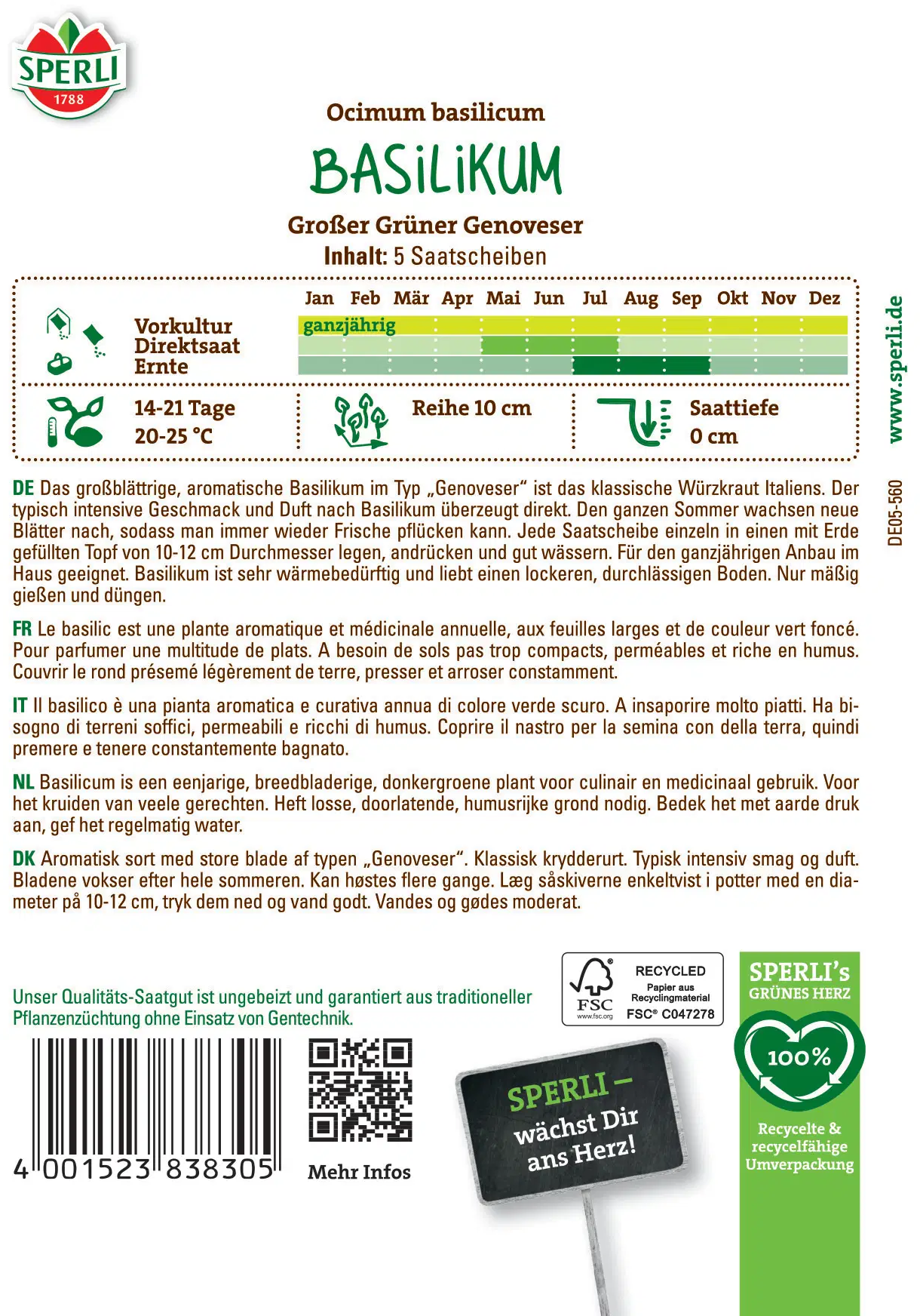 Grâce aux disques de semis, la culture devient un jeu d’enfant : couvrir le rond pré-semé légèrement de terre, presser et arroser constamment ! Les plantes poussent rapidement et produisent de larges feuilles de couleur vert foncé, idéales pour parfumer vos plats. Parfait pour les débutants ou ceux qui souhaitent cultiver du basilic frais sans complication.