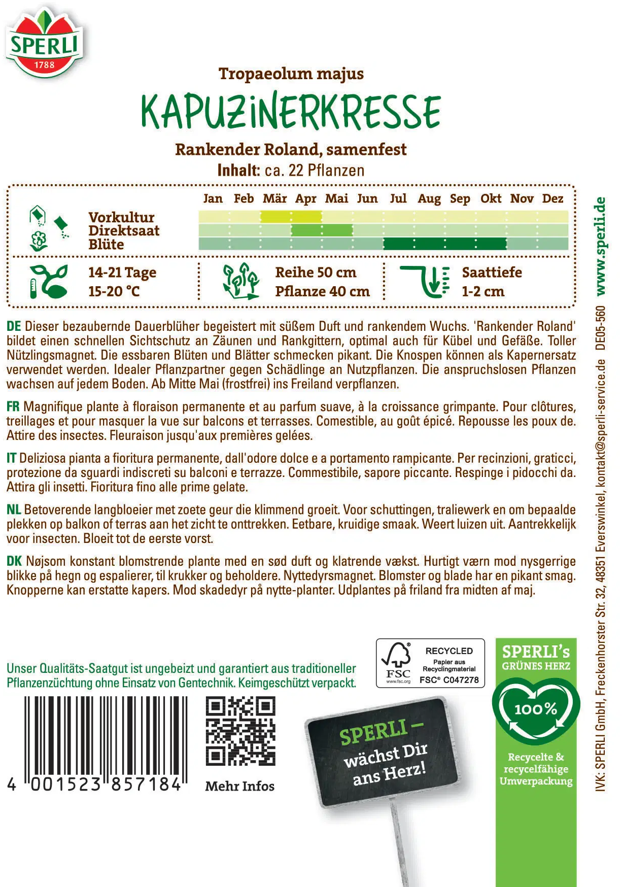 La capucine grimpante 'Rankender Roland' de SPERLI apporte une touche estivale au jardin grâce à ses fleurs éclatantes ! Cette plante à la floraison permanente, très facile d’entretien, grimpe rapidement : elle est idéale pour les clôtures, les treillages ou pour masquer la vue sur les balcons et terrasses. Ses tiges atteignent jusqu’à 3 m et offrent non seulement un spectacle floral, mais ses feuilles, fleurs et boutons floraux sont également comestibles et relèvent salades, beurres aux herbes ou fromage frais d’une note poivrée agréable.