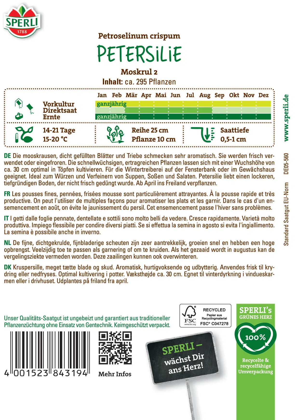 Ce persil est une variété classique aux feuilles fines, pennées, frisées mousse, appréciée pour son arôme intense et son excellent rendement. Il se cultive aussi bien en extérieur qu’à l’intérieur tout au long de l’année : idéal pour avoir toujours du persil frais à portée de main, pour la décoration ou l’assaisonnement.