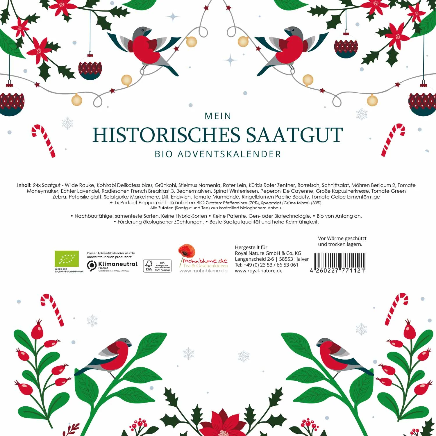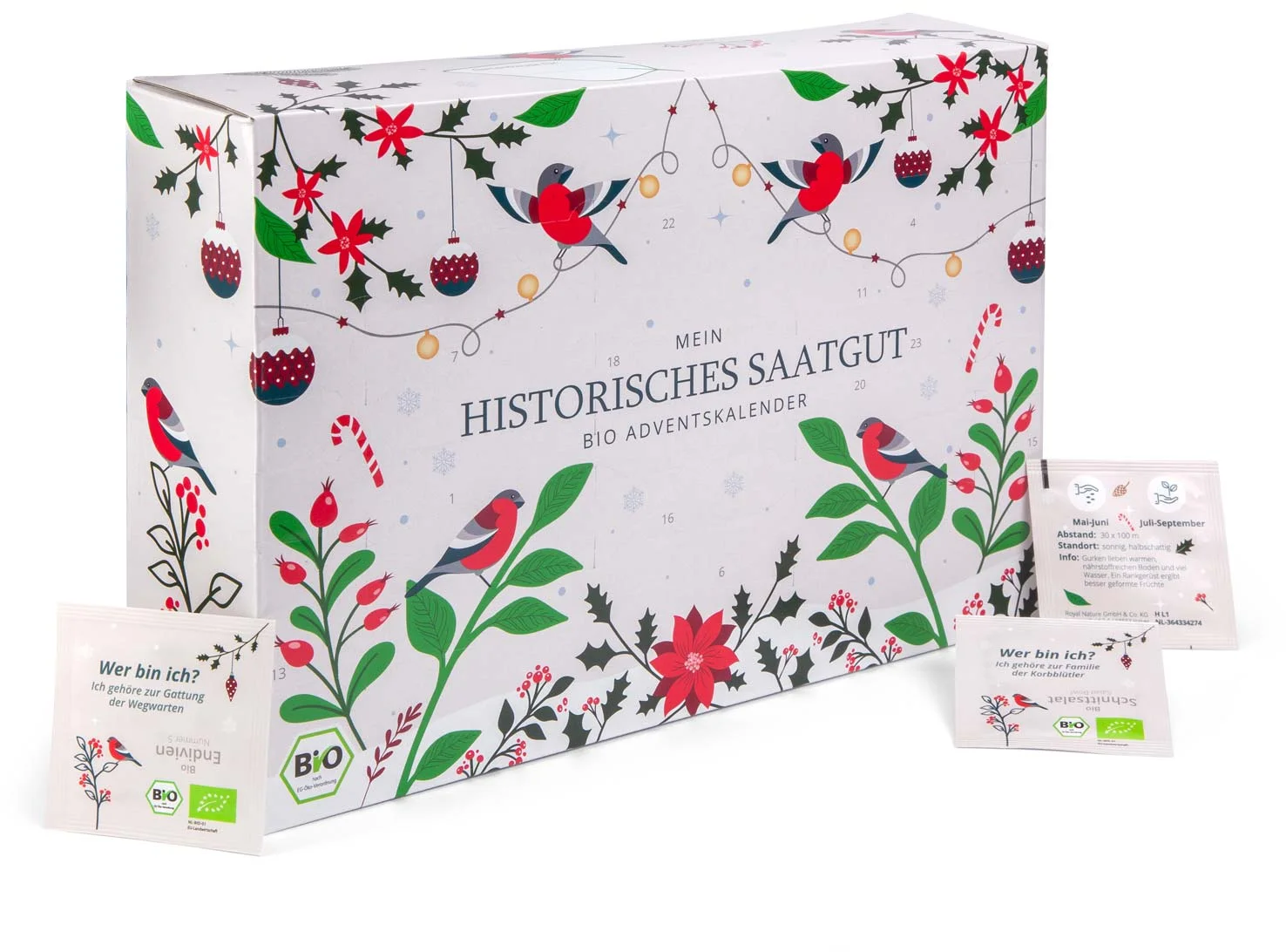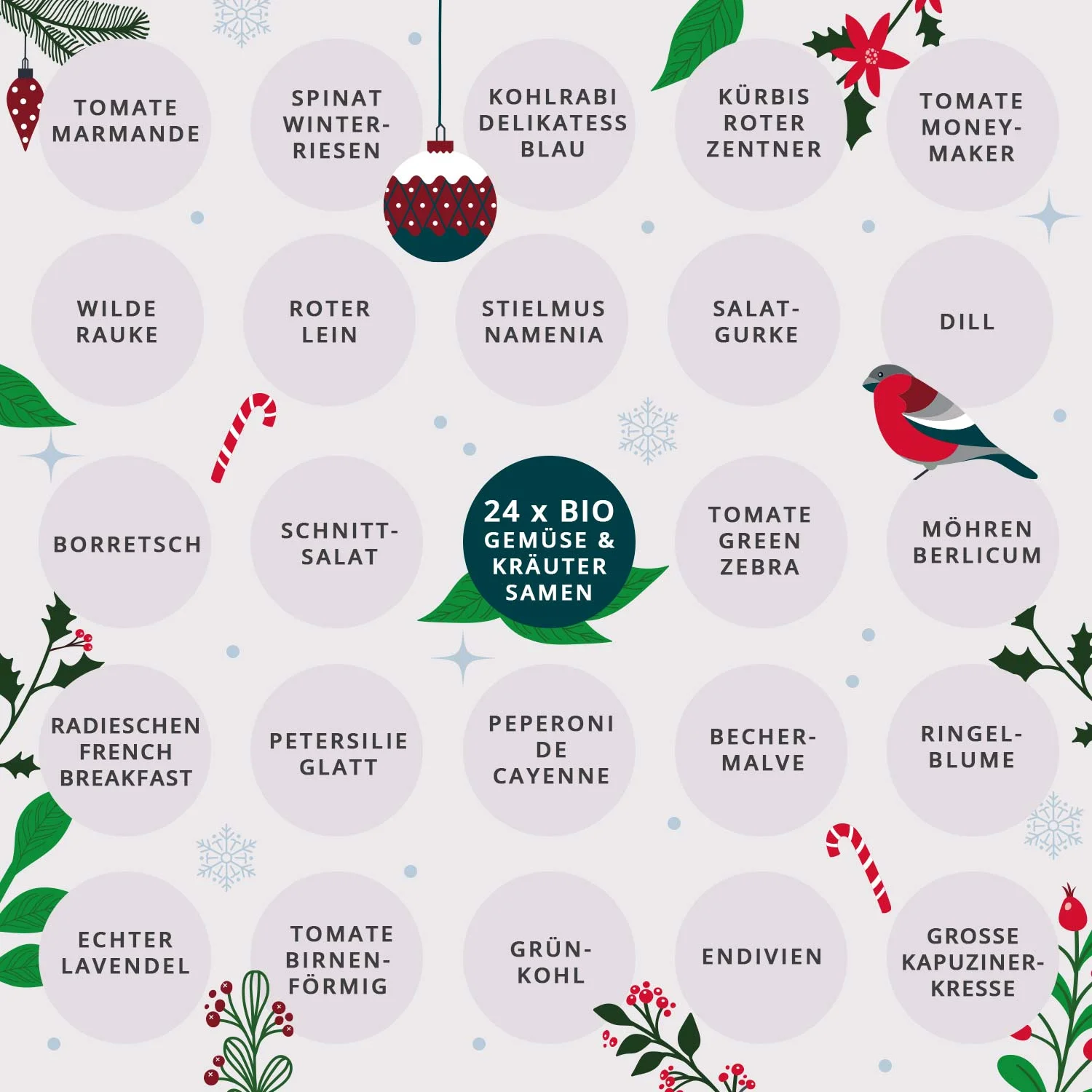 Deze adventskalender bevat 24 verschillende, historische soorten groenten en kruiden in biologische kwaliteit. Hierdoor is het een ideale startset met vergeten groente- en kruidenplantjes. Perfect voor iedereen die waarde hecht aan milieubescherming, het behoud van diersoorten en natuurlijke smaak.