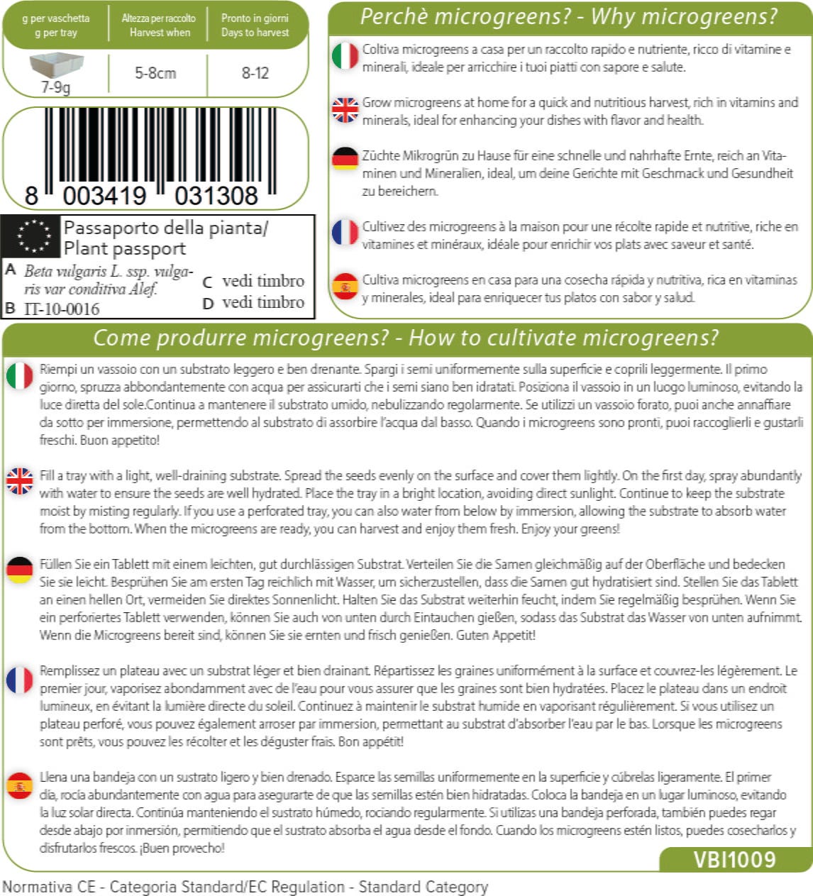 Verdeel de zaden gelijkmatig over een doorlatend substraat. Houd de kiemplantjes bij een groeihoogte van 5–6 cm gelijkmatig vochtig en vermijd direct zonlicht rond het middaguur om de malse textuur en de felle kleuren van de stelen te behouden.