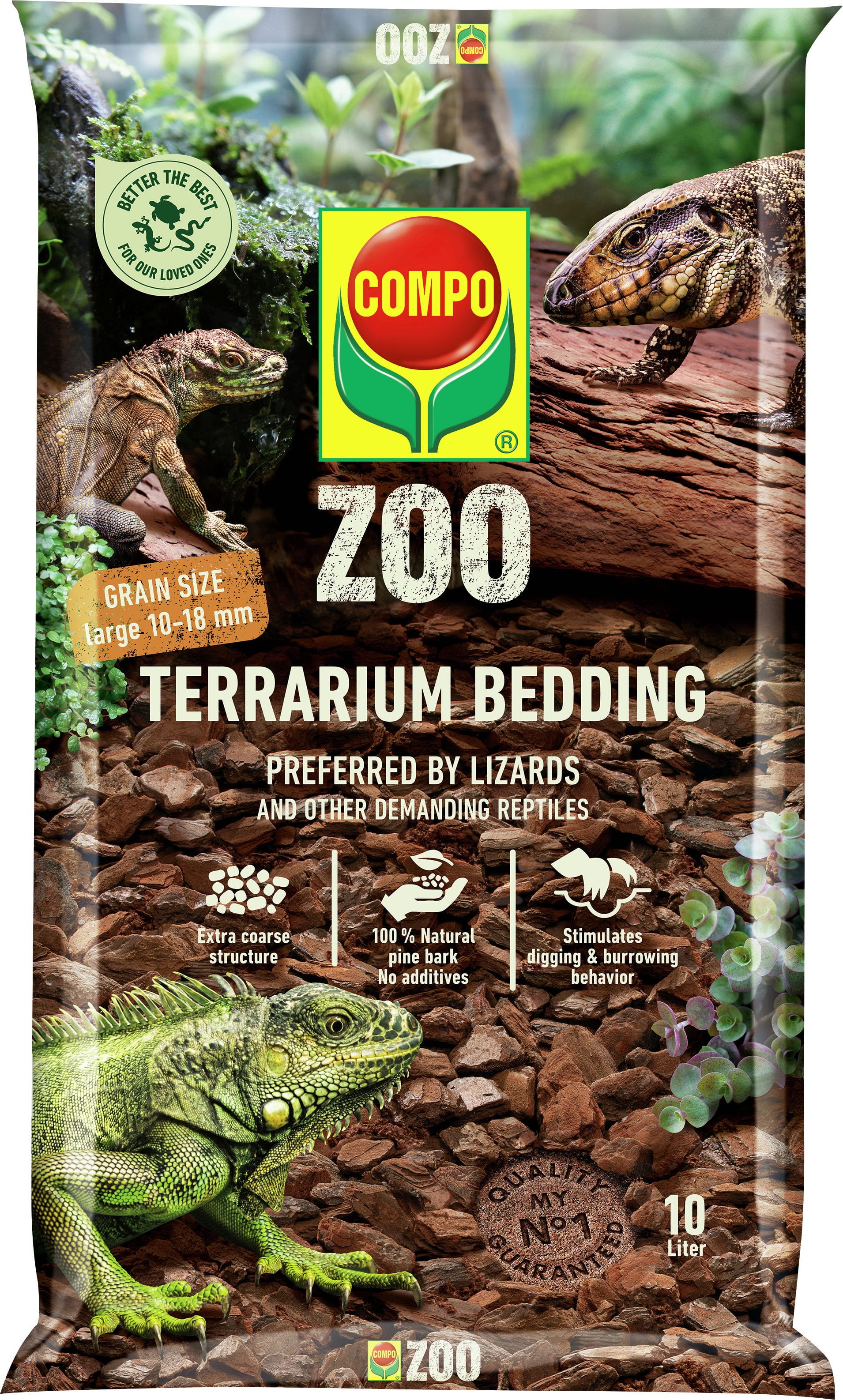 Het COMPO ZOO terrariumsubstraat voor grote dieren creëert de ideale leefomstandigheden voor grote hagedissen en veeleisende reptielen. Dit natuurproduct van pijnboomschors is bijzonder luchtig, licht en vezelvrij. Hierdoor kunnen je dieren naar hartenlust graven, woelen of hun eieren leggen, terwijl het substraat de vochtigheid reguleert en zorgt voor een optimaal klimaat in het terrarium – volledig zonder chemische toevoegingen.