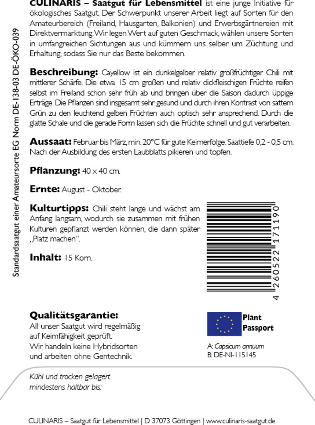 | Fabrikant: | Culinaris - Saatgut für Lebensmittel, Thiegasse 5, 37124, Rosdorf, Duitsland, info@culinaris-saatgut.de, culinaris-saatgut.de |