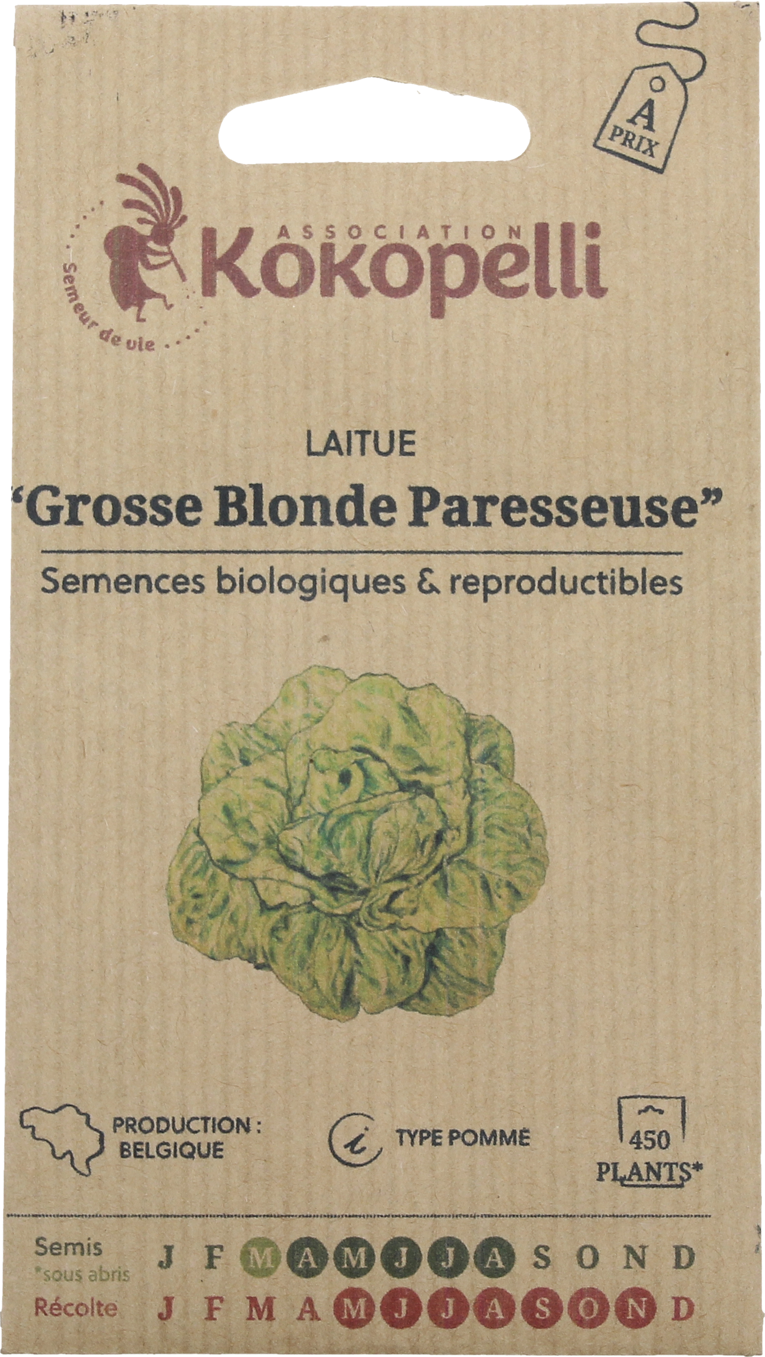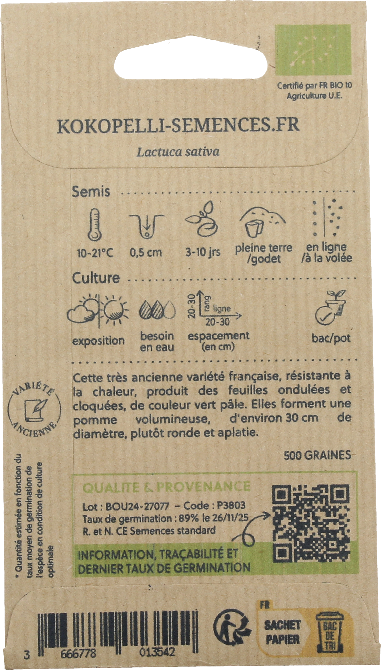 De biologische kropsla "Grosse Blonde Paresseuse" is een beproefd Frans ras dat bekendstaat om zijn grote, lichtgroene ("blonde") kroppen. Deze sla is bijzonder geliefd omdat hij zeer traag doorschiet, wat hem perfect maakt voor de teelt tijdens warmere periodes. Geniet van een malse, knapperige structuur en een milde smaak, direct uit eigen tuin.