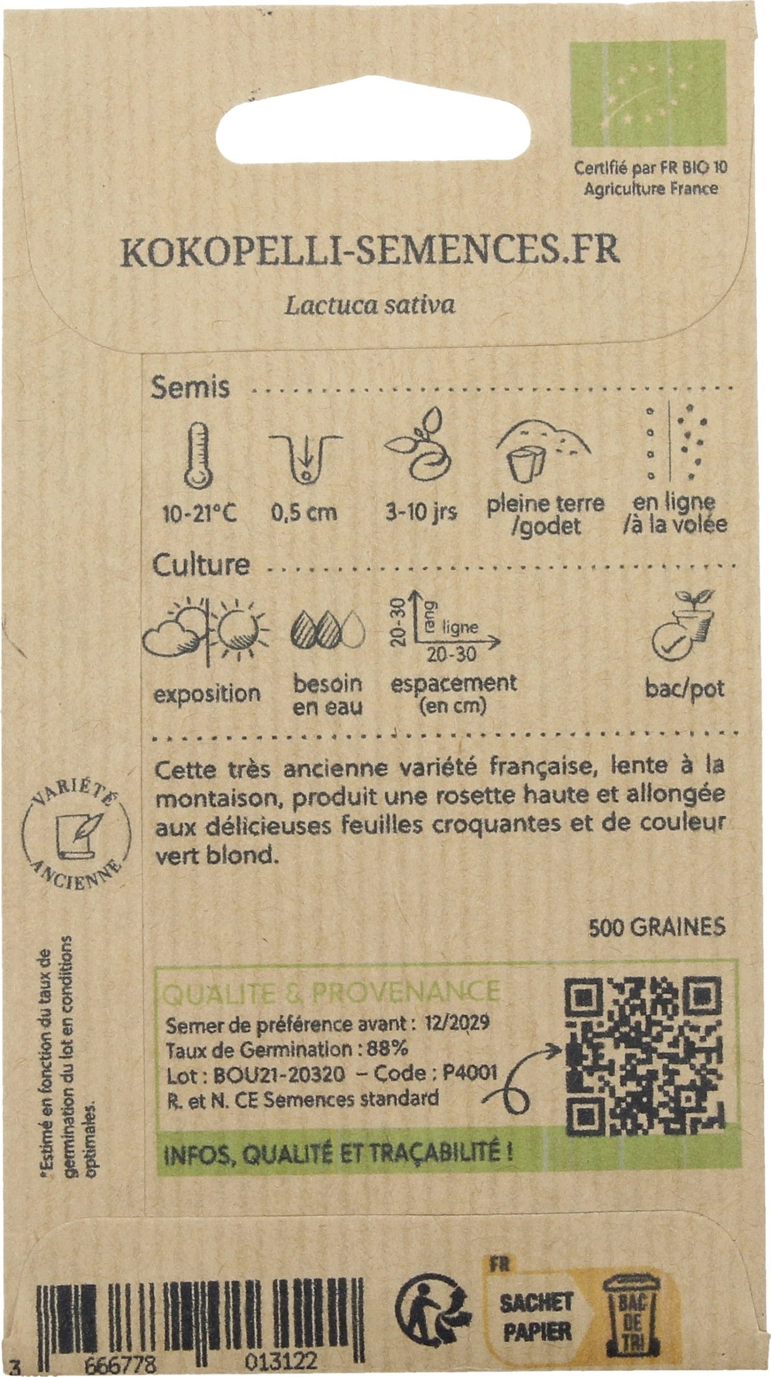 Kokopelli Biologische Romeinse Sla "Blonde Maraîchère", 500 Korrels