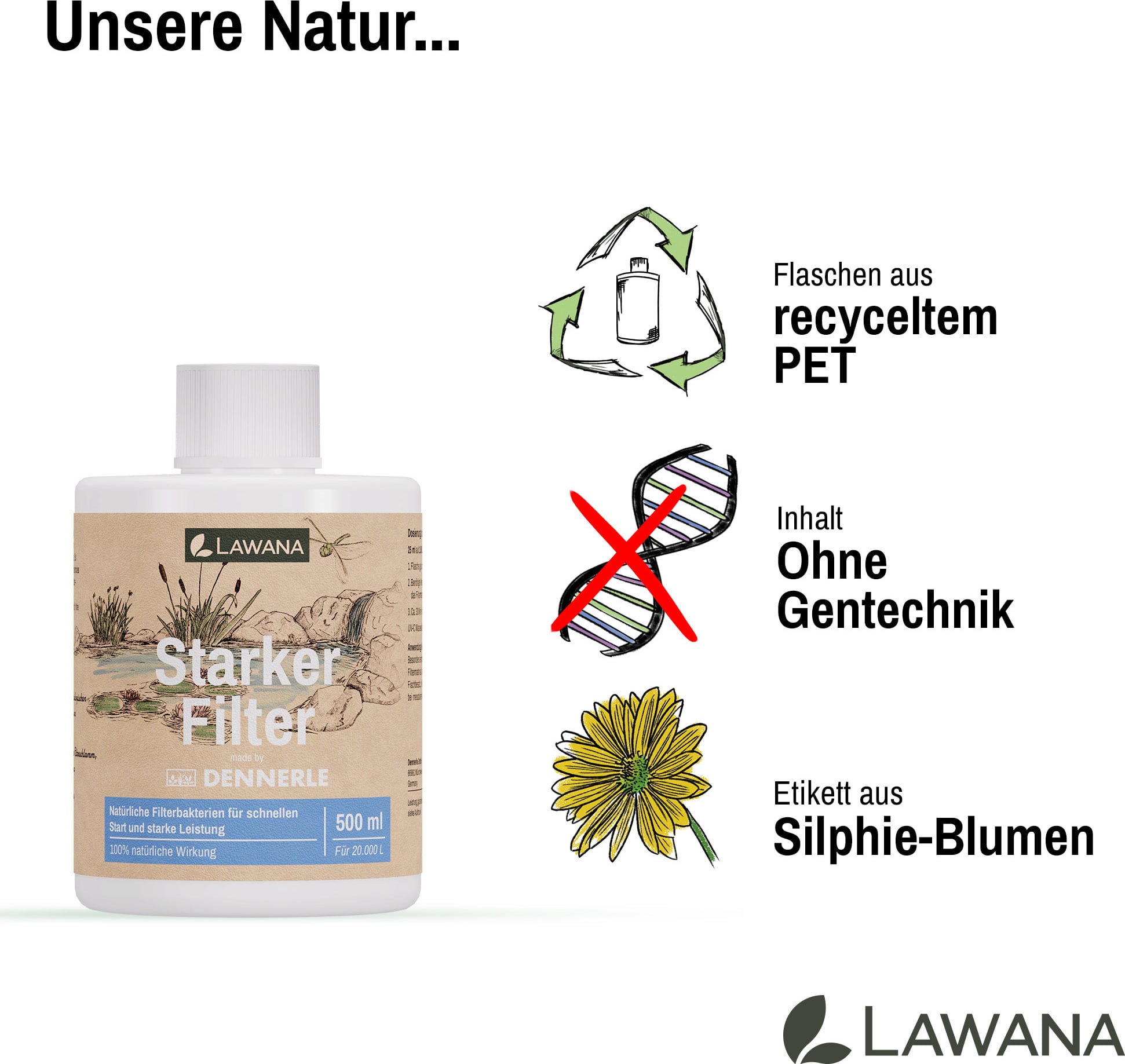 Met de Sterke Filter van LAWANA optimaliseer je het hart van je vijver en zorg je voor een krachtige biologische activatie van je filtersysteem! De hooggeconcentreerde oplossing met meer dan 100 miljoen natuurlijke bacteriën per milliliter versnelt de inloopfase van nieuwe vijvers enorm en verhoogt de efficiëntie van bestaande systemen door organische belastingen zoals vetten, eiwitten en koolhydraten direct in het filter af te breken.