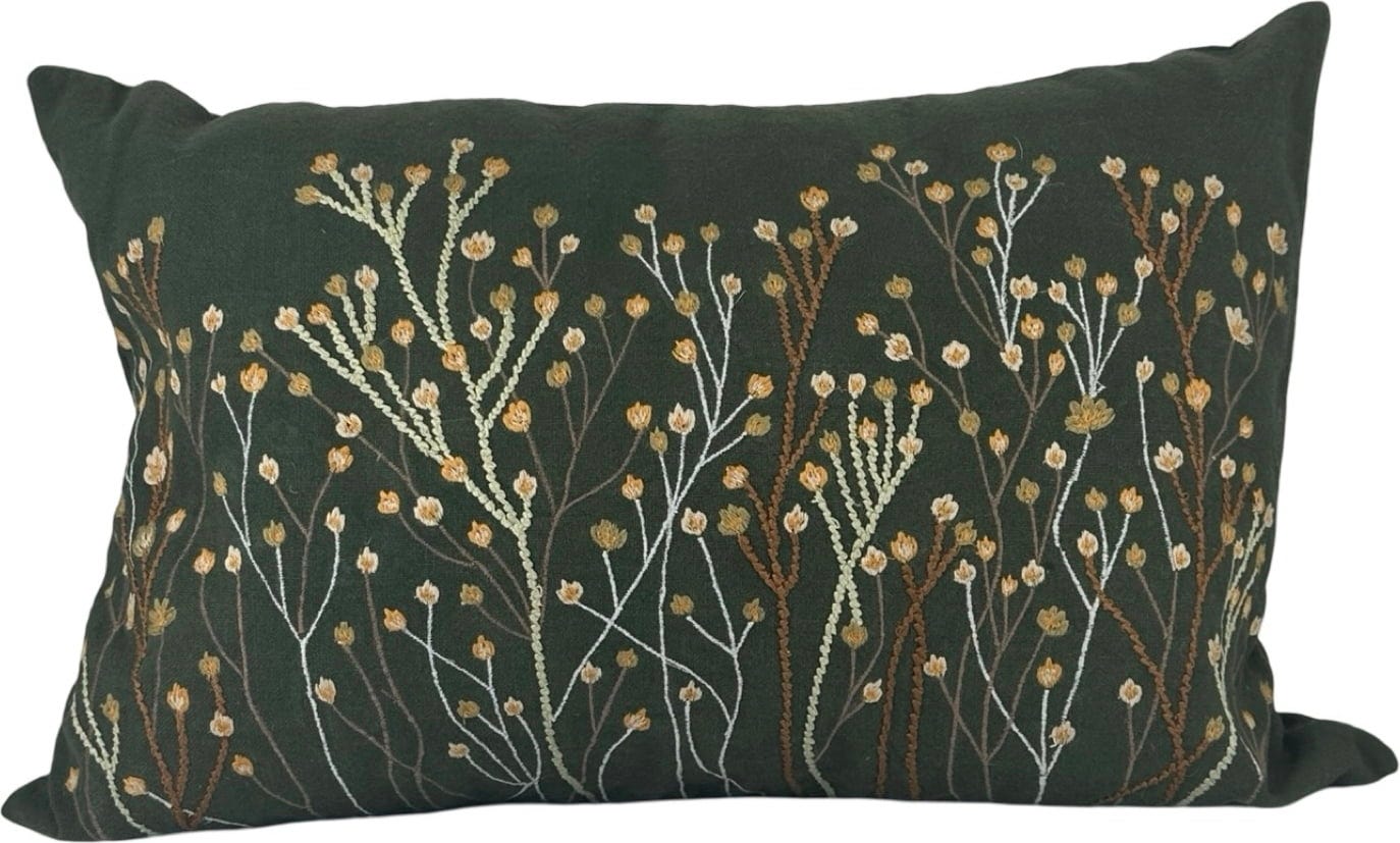 De kussenhoes "Paniculata Moss" geeft je huis een natuurlijke, rustige sfeer. De donkergroene katoenen stof wordt aangevuld met delicate, geborduurde bloemknoppen in warme aardetinten - een echte blikvanger op de bank of het bed.