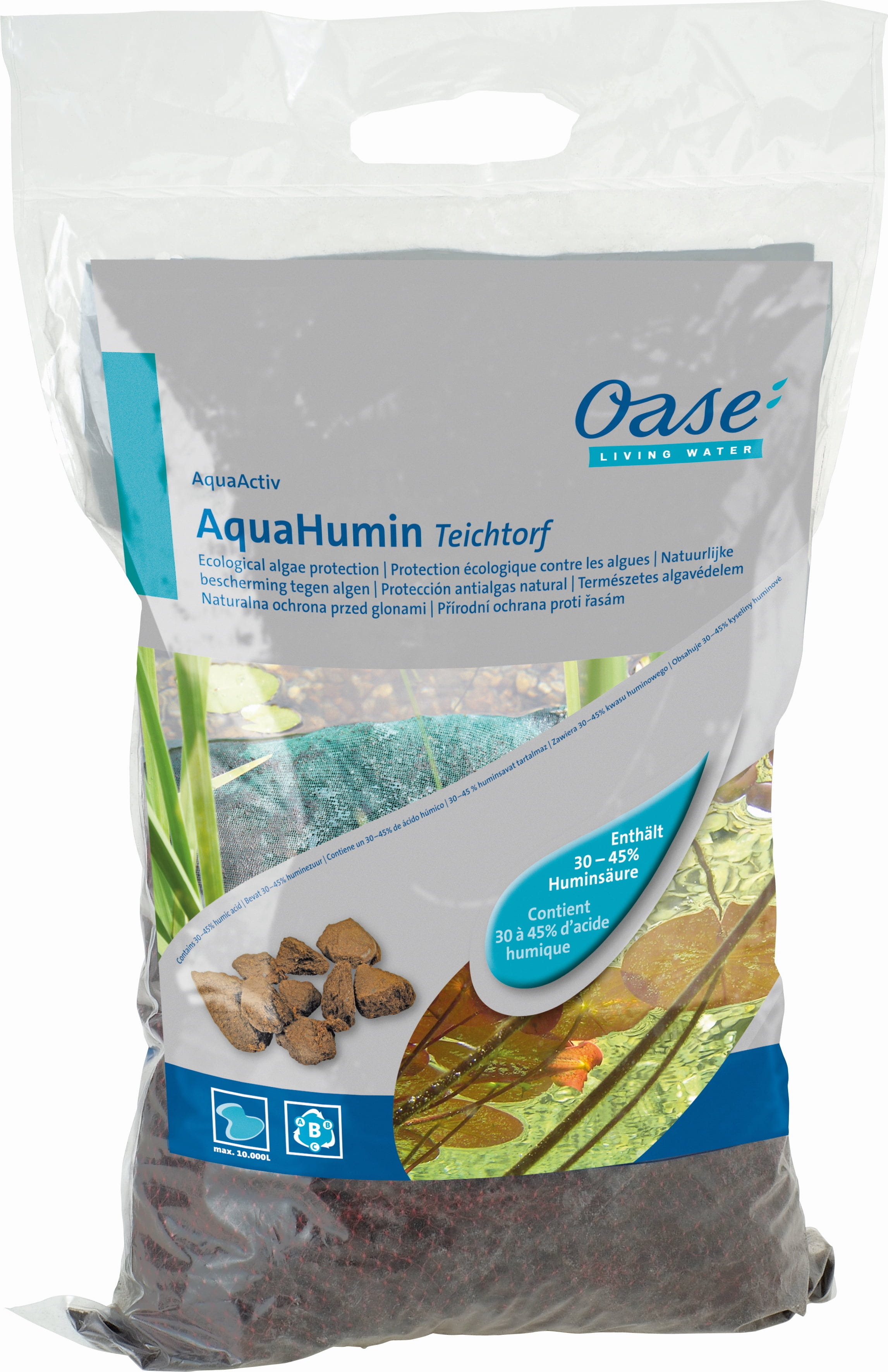 De Oase AquaActiv AquaHumin is een speciale turf voor fysieke algenpreventie dankzij het zonnebrileffect. Het bevat 30-45% humuszuur, verzacht het water en verlaagt de pH-waarde op een zachte manier.