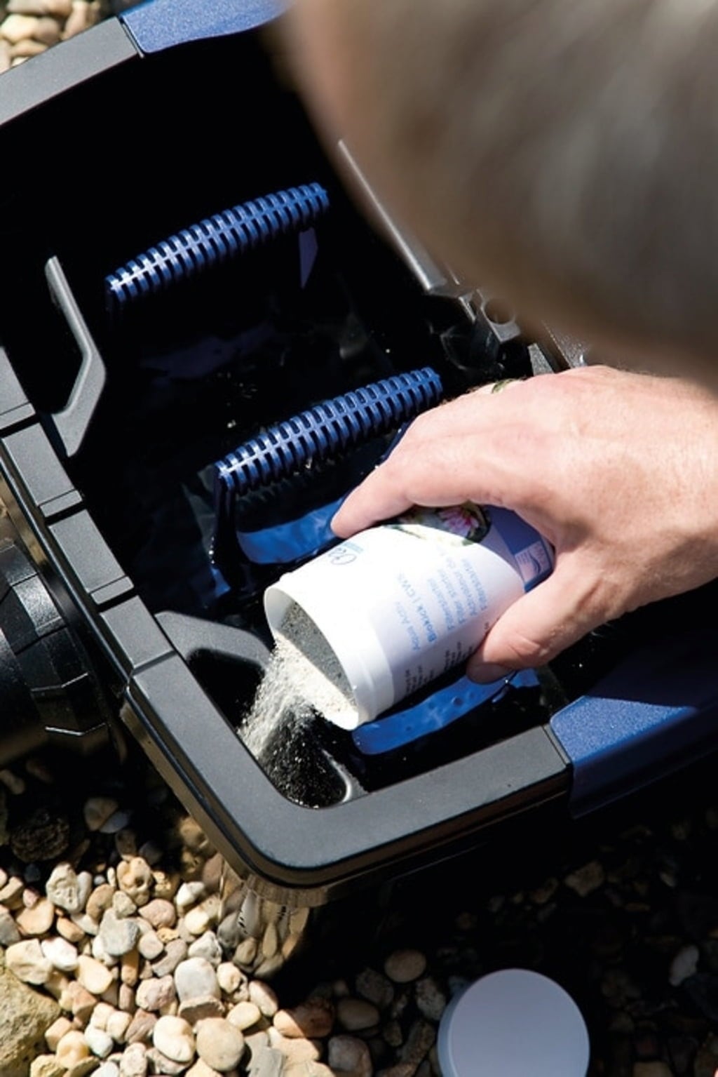 - Giet het AquaActiv Biokick poeder van Oase direct op de filtersponzen of in de vulkamer van het vijverfilter.