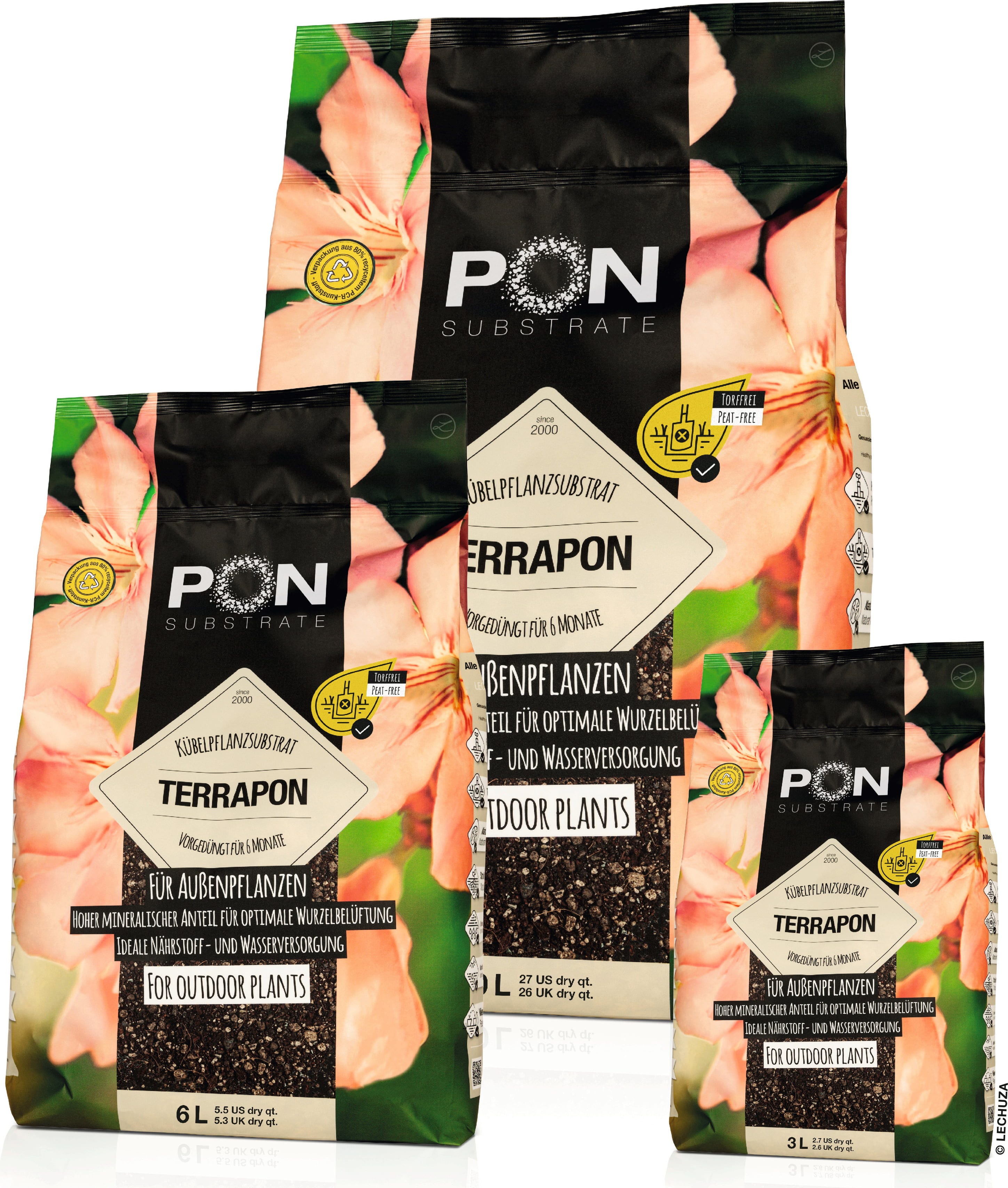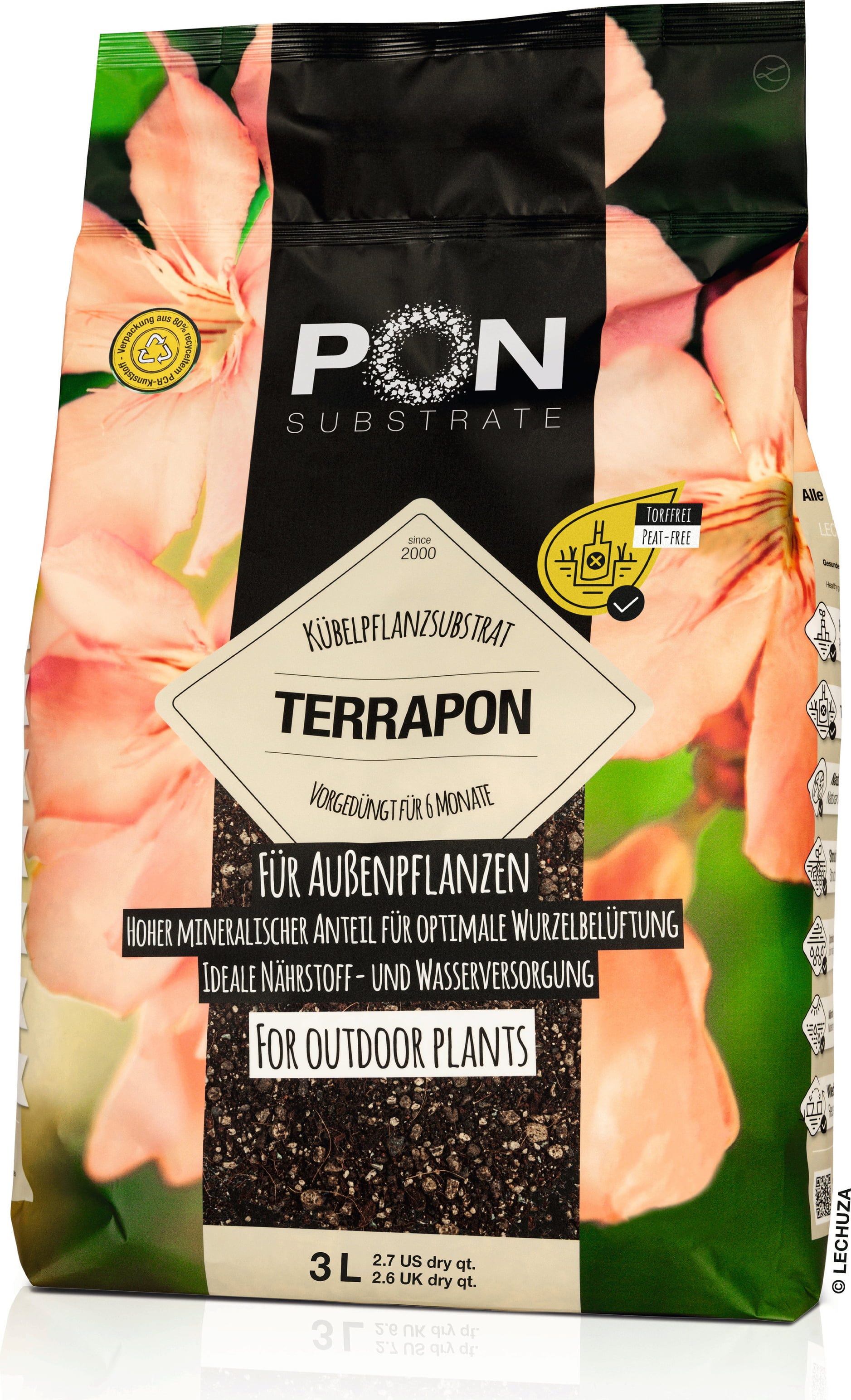 Met Terrapon maak je een perfecte start van het tuinseizoen. Het voorbemeste substraat geeft gedurende 6 tot 8 maanden continu voedingsstoffen af, zodat je bloeiende planten blijvend vitaal blijven. Het hoge drainagevermogen voorkomt wortelrot en zorgt ervoor dat je kuipplanten ook bij wisselvallig weer optimaal verzorgd zijn.