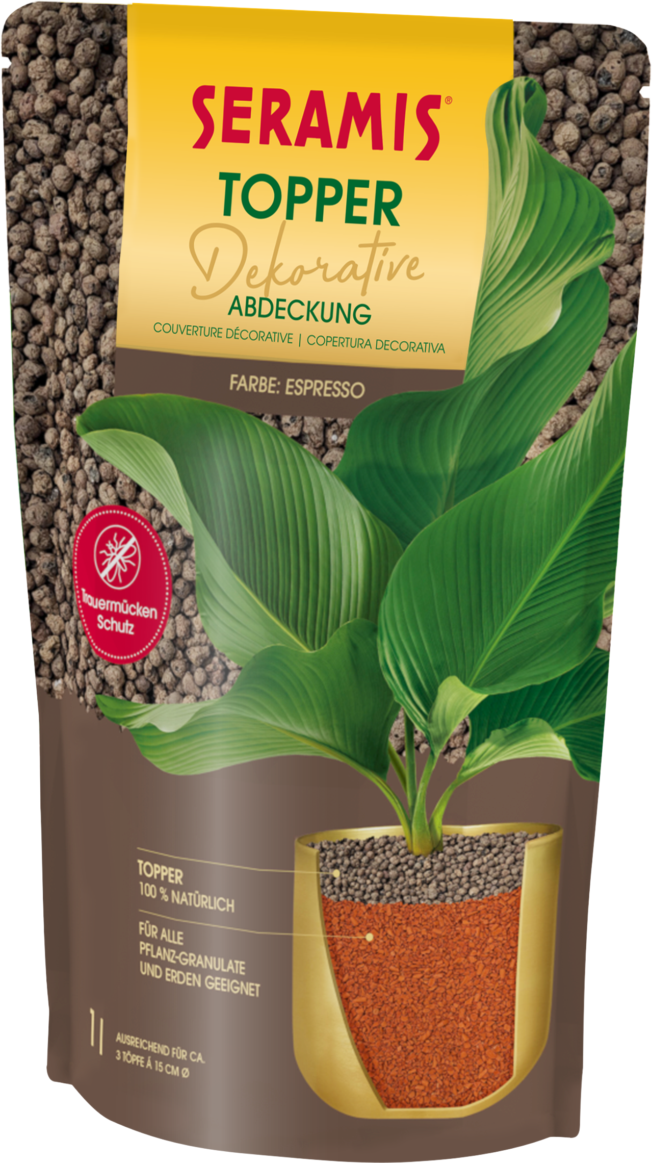 De SERAMIS® Topper is geschikt als afdeklaag voor elk type substraat en is even decoratief als functioneel. Verkrijgbaar in 4 aantrekkelijke kleurtinten past hij optisch perfect bij verschillende interieurstijlen, terwijl hij tegelijkertijd effectief beschermt tegen rouwvliegjes.