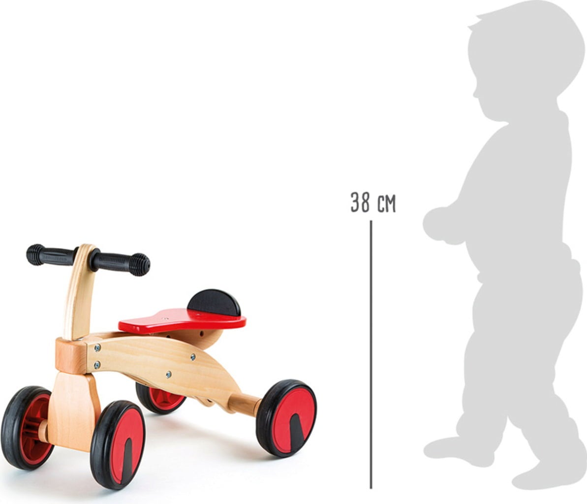 Kleine ontdekkingsreizigers vanaf 12 maanden kunnen echt aan de slag met deze strakke loopfiets. Dankzij de hoogwaardige rubberen banden rolt de loopfiets rustig over de vloer. Ergonomisch gevormde rubberen handgrepen, stevig hout en robuuste productie zorgen voor superieur rijplezier. Perfect voor kinderen die leren lopen!