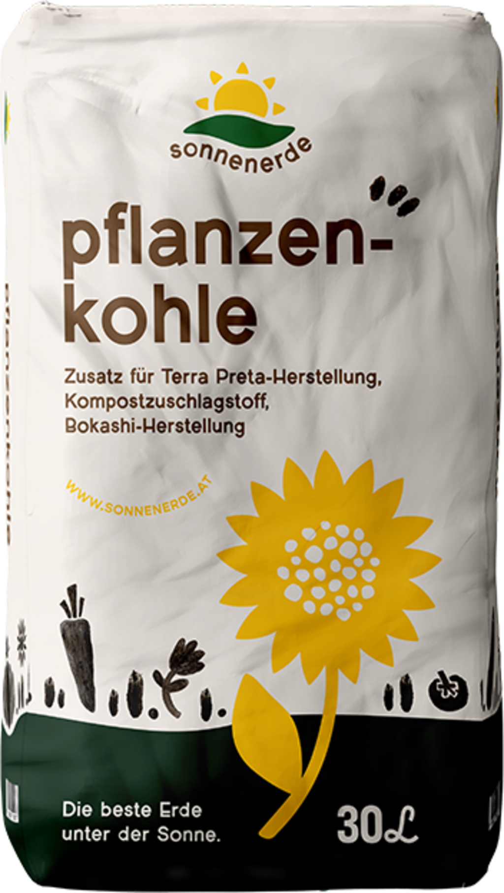 Biochar zorgt voor een beter behoud van voedingsstoffen in de bodem, omdat het grote oppervlak een perfecte habitat vormt voor micro-organismen. Sonnenerde biochar wordt gemaakt van tarwe spelt, zonnebloem schillen en fruitresten: deze componenten worden verhit tot 600 °C in afwezigheid van lucht en vervolgens geblust met water.